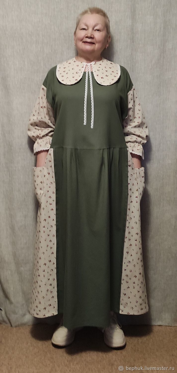 Платье большого размера из льна с вискозой насыщенного зеленого фисташкового цвета дополнено льном с мелкими цветочными букетиками. Верх платья чуть ниже линии талии из однотонного льна с вискозой. Юбка широкая с боковыми вставками из льна с цветочками. Карманы накладные расположены на боках юбки. Рукава украшены кружевом, собраны резинкой, это позволяет регулировать расположение рукавов на руках. Несмотря на большой размер, платье стройнит фигуру за счет вертикальных линий на юбке. Наличие накладного воротника позволит сделать платье нарядным, без воротника украсьте себя бусами. Рекомендую это платье дамам 56-58 размера. Материалы: лен, лён с вискозой, кружево, карманка Размер: ОГ 126 см ОТ119 см ОБ 190 см Длина платья 131,5 см